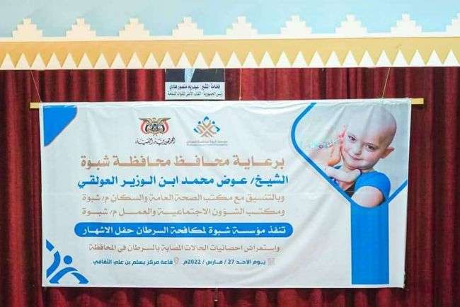 برعاية محافظ محافظة شبوة عوض بن الوزير العولقي نفذت صباح اليوم مؤسسة شبوة لمكافحة السرطان وبالتنسيق مع مكتبي الصحة والسكان والشؤون الاجتماعية والعمل حفل إشهار المؤسسة واستعراض إحصائيات الحالات المصابة بالسرطان في المحافظة.