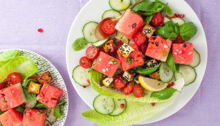 البطيخ من الفاكهة الغنية بالعصارة وهي طريقة جيدة لإبقاء الجسم رطباً مع الحفاظ على السعرات الحرارية، ومن أجل الشعور بالامتلاء ينصح بتناوله مع جبنة الحلوم.