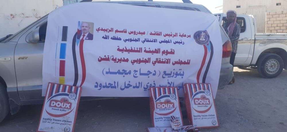 دشنت القيادة المحلية للمجلس الانتقالي الجنوبي في مديرية قشن بمحافظة المهرة اليوم،توزيع الدجاج المجمد للأسر ذوي الدخل المحدود انطلاقاً من حي الشعب بالمديرية ويأتي ذلك ضمن الأنشطة الأنسانية للمجلس خلال الشهر الفضيل ،