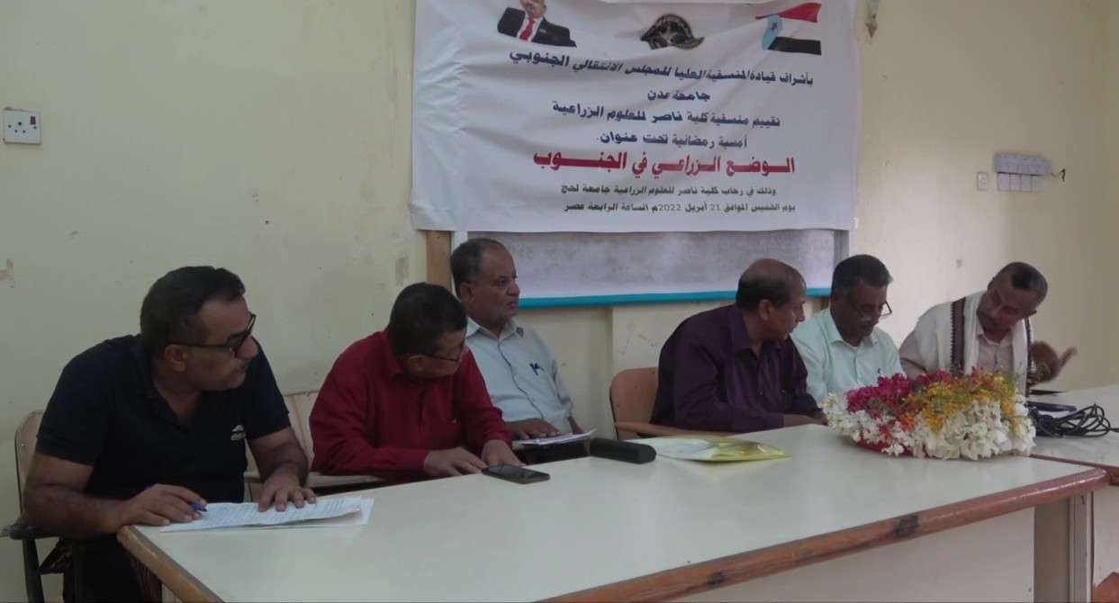 تحت عنوان:.(( الوضع الزراعي في الجنوب )) . نظمت منسقية المجلس الانتقالي الجنوبي في كلية الزراعة بلحج أمسية رمضانية مساء يوم امس الخميس الموافق 21 ابريل 2022 م تحت عنوان "واقع الوضع الزراعي في الجنوب".