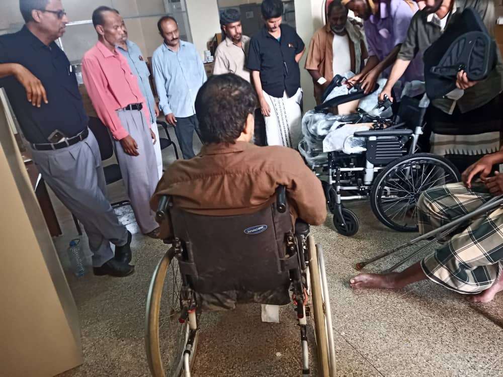 مكتب الصحة بلحج يوزع كرسين كهربائية متحركة للجرحى واخر لمعاق