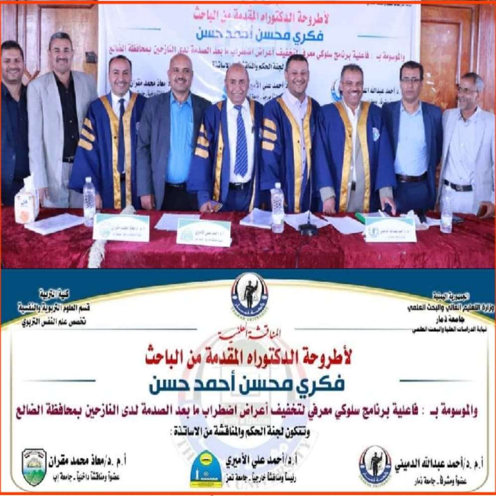 نال الباحث " فكري محسن احمد القطوي " درجة الدكتوراه بامتياز من قسم علم النفس في كلية التربية بجامعة ذمار على أطروحته الموسومه ب: " فاعلية برنامج سلوكي معرفي لتخفيف أعراض إضطراب مابعد الصدمة لدى النازحين بمحافظة الضالع "