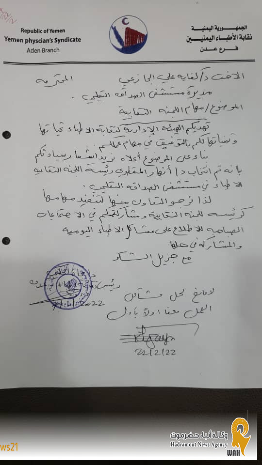 وتاسفت الدكتورة /انهار المقطري، رئيس نقابة اطباء المشفى والتي تم انتخابها بصورة رسمية وبحسب البيان الذي تاسف على انجرار وسائل الإعلام وراء نشر بيانات لاتحمل الصفة الأهلية والمتمثلة بالاختام.