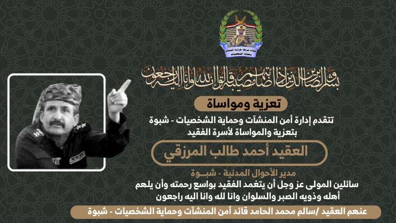 بتعزية والمواساة لأسرة الفقيد /العقيد أحمد طالب المرزقي مدير الأحوال المدنية - شبـــوة