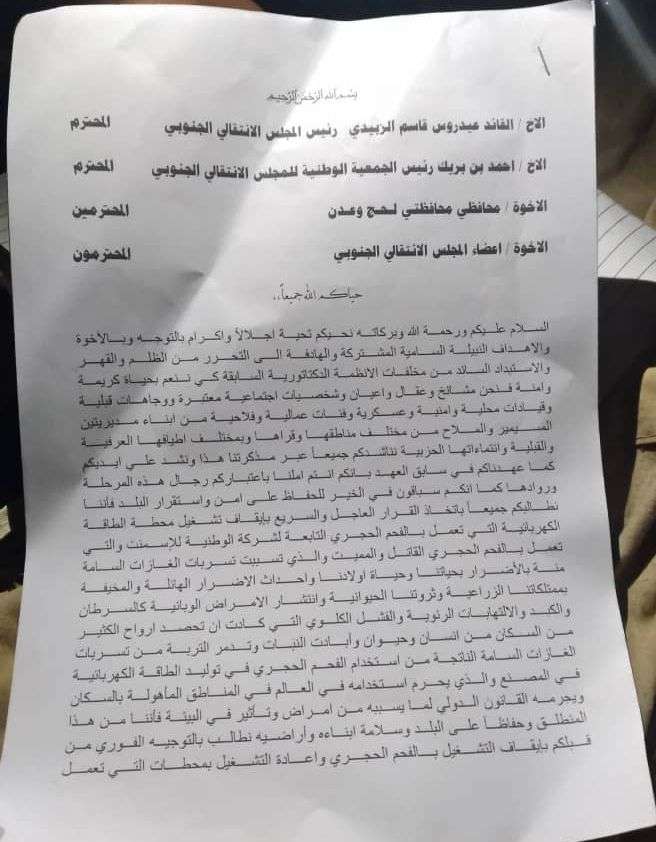 ووجه المجتمعون بيانا الى الرئيس عيدروس الزبيدي وللقادة والمسؤولين الأخرين تضمن المطالب التالية: