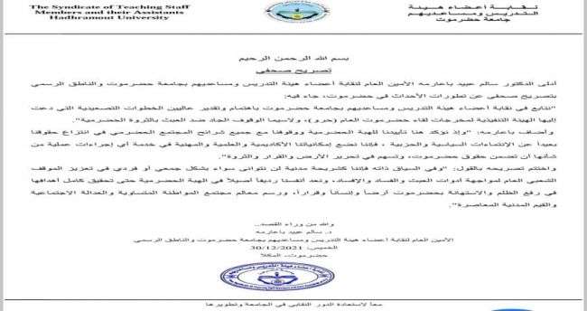 وقال الدكتور سالم : نتابع في نقابة أعضاء هيئة التدريس ومساعديهم في جامعة حضرموت، باهتمام وتقدير عاليين الخطوات التصعيدية التي دعت إليها الهيئة التنفيذية لمخرحات لقاء حضرموت العام (حرو)، ولا سيما الوقوف الجاد ضد العبث بثروات حضرموت".