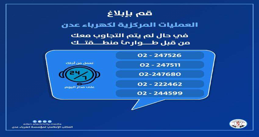 "في حال عدم الرد عليك من قبل الطوارئ لأي ظرف ما، يمكنك الإتصال على أرقام العمليات المركزية المشتركة لكهرباء عدن المدونة في الصورة، والذي بدورهم سيقومون بمتابعة قسم الطوارئ بمنطقتك"