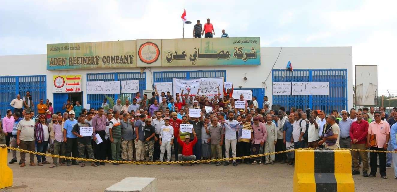 نفذ عمال وموظفي شركة مصافي عدن، اليوم الثلاثاء، أمام الباب الرئيسي للمصفاة في مديرية البريقة، وقفة إحتجاجية، بناءً على دعوة من نقابة عمال المصافي .