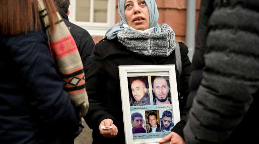 ياسمين المشّان تحمل صور أشقائها الذين قضوا تحت التعذيب في سوريا خارج مبنى المحكمة بكوبلنس