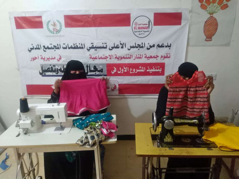 بدعم من المجلس التنسيقي الاعلى لمنظمات المجتمع المدني في محافظة ابين دشنت جمعية المنار التنموية الاجتماعية في مديرية احور تنفيذ المشروع الاول في مجال الخياطة بدورة شارك فيها 20 متدربة ، مدة الدورة 20 يوما حيث بدأت الدورة تاريخ 15/1/2020 وتنتهي الدوره 5/2/2020