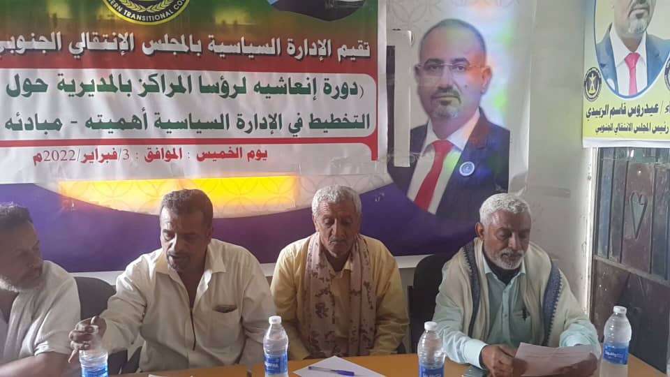 نظمت الإدارة السياسية بالهيئة التنفيذية للمجلس الانتقالي الجنوبي في مديرية لودر بمحافظة أبين اليوم الخميس دورة تدريبية إنعاشية في مقر القيادة المحلية في مجال التخطيط والتقييم والمتابعة لرؤساء مراكز المديرية والبالغ عددها 26 مركز.