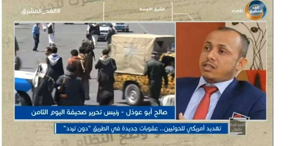 واستضافت الحلقة رئيس تحرير صحيفة اليوم الثامن الصحفي صالح ابو عوذل الذي قال في مداخلته أن ما تقوم به مليشيات الحوثي على مدى ثمان سنوات من استهداف وقصف للمدنيين في الجنوب والمحافظات الشمالية وايضا استهداف السعودية والإمارات هي أعمال إرهابية ، مشيرا إلى أن الإجرام والإرهاب الممارس من الحوثي يعد التصنيف الأول قبل أن تصنفهم امريكا والمجتمع الدولي ويفترض أن يكون الحوثي في قائمة الإرهاب فمشروعه قائم على الإرهاب إضافة إلى أنه على علاقة بالجماعات الإرهابية والقاعدة وداعش .