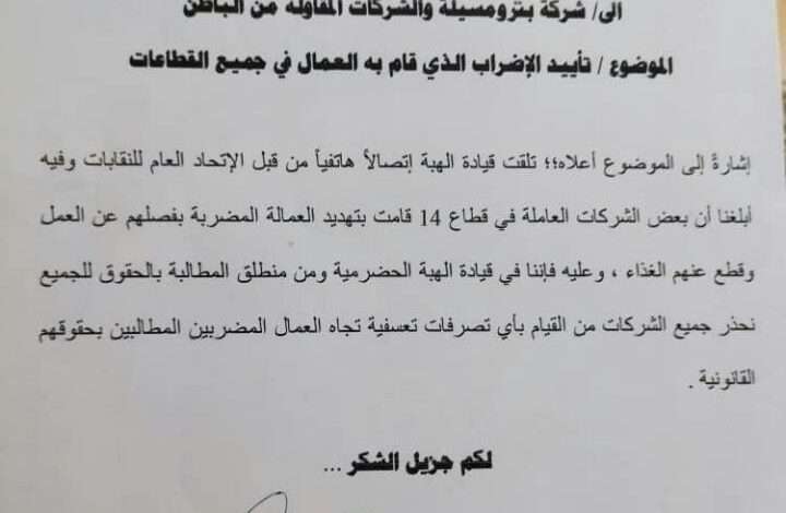 وحذرت قيادة الهبة الحضرمية بعض الشركات العاملة في قطاع 14 من القيام بأي تصرفات تعسفية تجاه العمال المضربين المطالبين بحقوقهم.