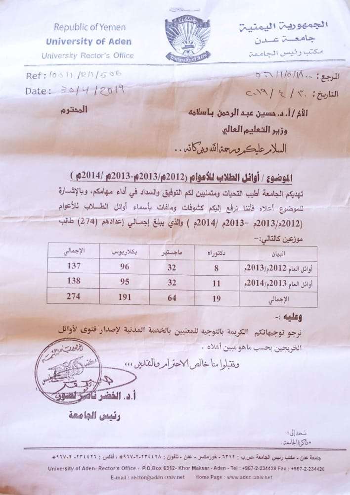 وقالوا: نحن أوائل الدفع في مختلف كليات جامعة عدن نعاني من الظلم والحرمان نجدد مناشداتنا لمن يهمه الأمر، ونؤكد أنه يوجد لدينا قرار جمهوري صدر في وقت سابق نص على أن تكون الأولوية لنا في التوظيف داخل الجامعة، علما اننا ومنذ تخرجنا نعمل بشكل طوعي لخدمة الوطن والجامعة، ونقوم بمهامنا الأكاديمية في مختلف أقسام الكليات دون تقاضي أي مستحقات مادية، وليس لنا بعد كل هذا من مطلب غير تطبيق القرار الجمهوري الذي يقضي بتوظيفنا واستيعابنا ماليا وإداريا بصورة رسمية ضمن القوة الوظيفية لهيئة التدريس بجامعة عدن".