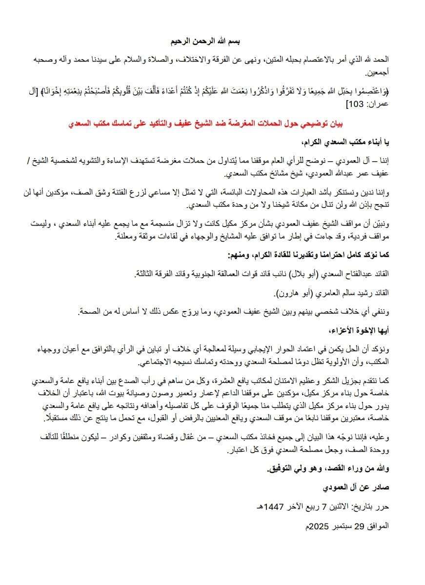 وعليه، فإننا نوجّه هذا البيان إلى جميع فخائذ مكتب السعدي – من عُقال وقضاة ومثقفين وكوادر – ليكون منطلقًا للتآلف ووحدة الصف، وجعل مصلحة السعدي فوق كل اعتبار.