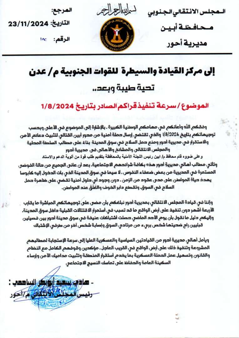 وطالب المجلس الجهات المختصة في محافظة أبين بسرعة تنفيذ التوجيهات العليا، وإرسال قوة عسكرية لدعم الأجهزة الأمنية وتمكينها من فرض الأمن والاستقرار في المديرية، وضمان عودة الحركة الطبيعية في الخط الساحلي الحيوي الرابط بين عدد من المحافظات الجنوبية.