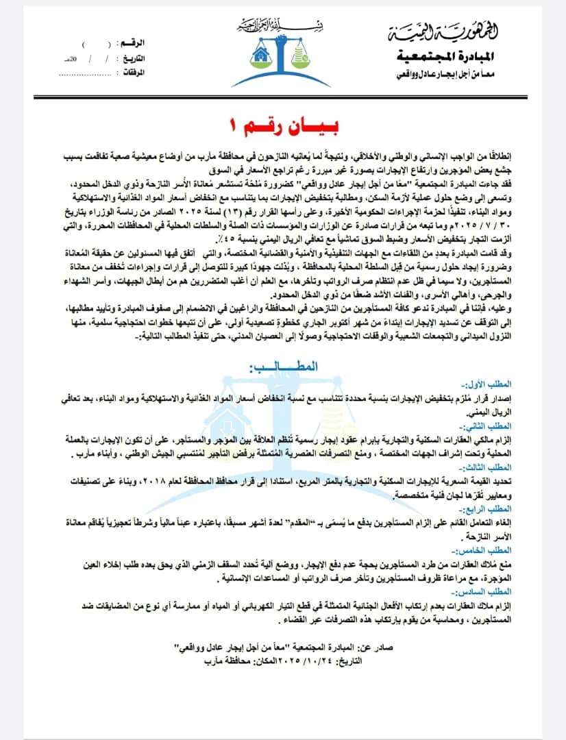 مبادرة مجتمعية في مأرب تدعو المواطنين إلى التوقف عن دفع الإيجارات اعتبارًا من أكتوبر الجاري