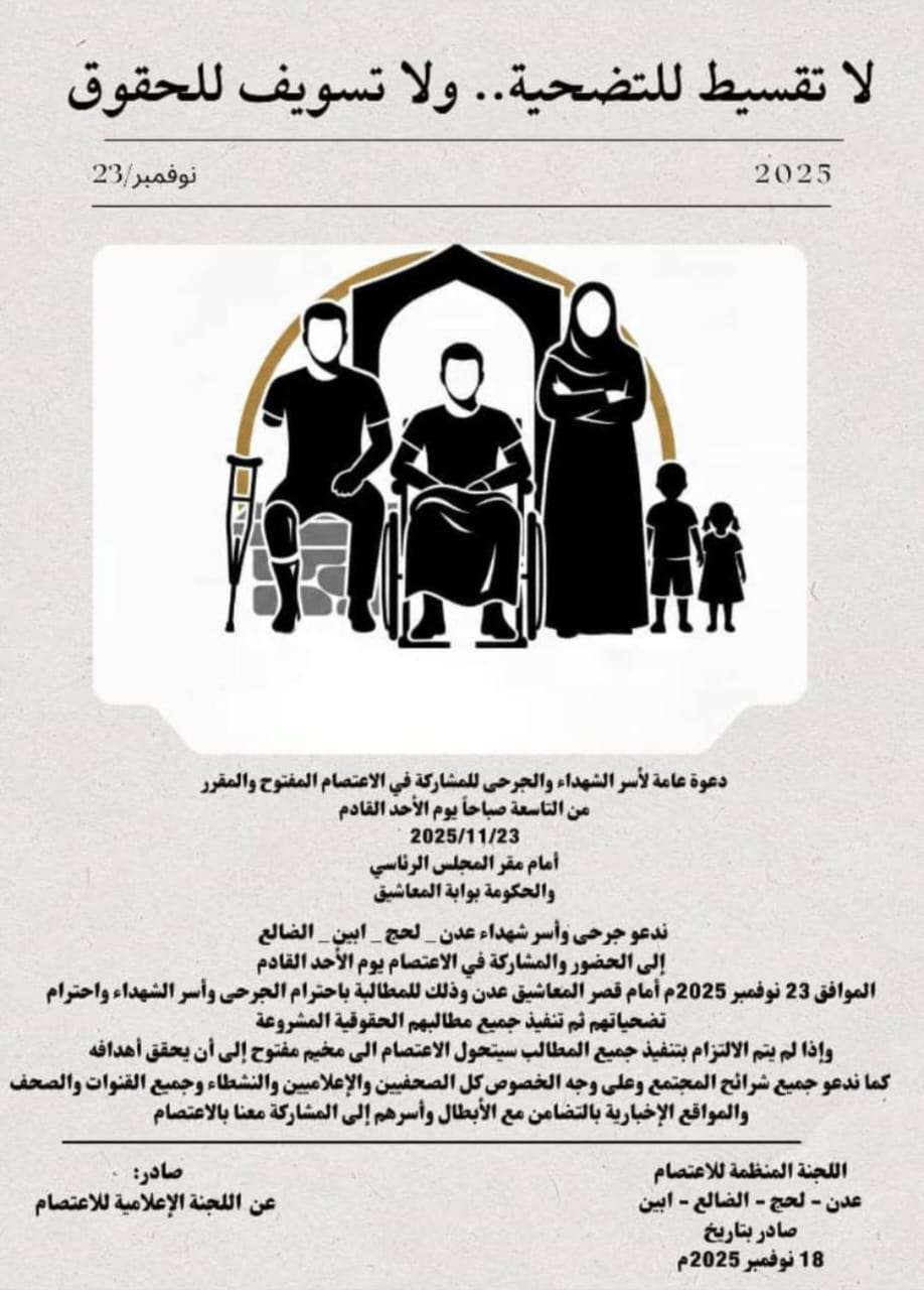وفي بيانها، دعت اللجنة التحضيرية كافة الجرحى وأسر الشهداء للمشاركة في الاعتصام، بعد تجاهل مطالبهم لسنوات طويلة ومماطلة متعمدة من قبل مجلس القيادة ورئاسة الوزراء.