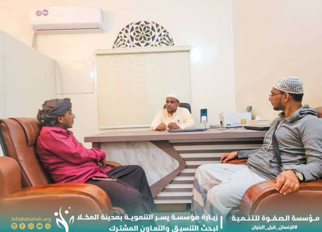 زار مسؤول الإعلام والعلاقات العامة بمؤسسة الصفوة للتنمية أحمد باضاوي، مؤسسة يسر للتنمية بمدينة المكلا - محافظة حضرموت، وكان في استقباله الأستاذ فواز باحمل، رئيس المؤسسة، وذلك لبحث مجالات التنسيق والتعاون المشترك بين الجانبين.