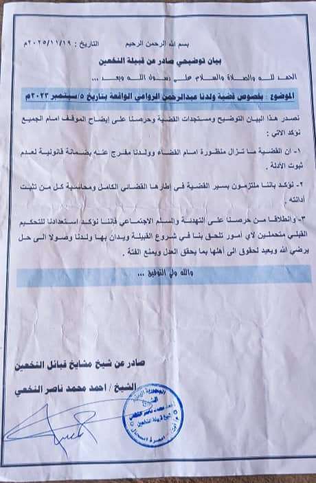 قبيلة النخعين تصدر بيان توضيحي حول قضية ولدها عبدالرحمن الرواعي