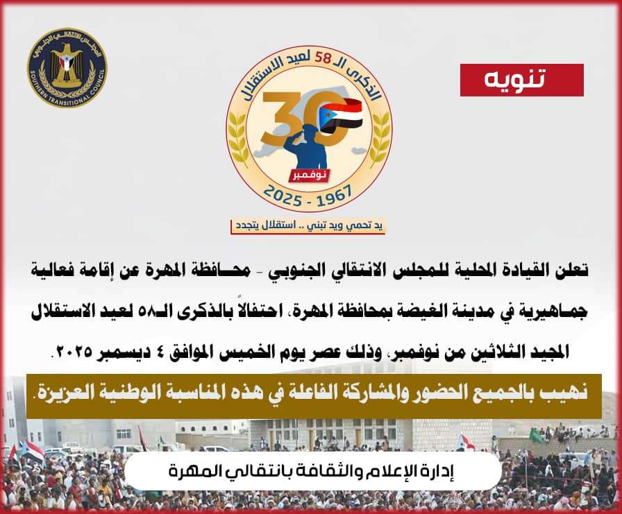 تعلن القيادة المحلية للمجلس الانتقالي الجنوبي – محافظة المهرة عن إقامة فعالية جماهيرية بمدينة الغيضة بمحافظة المهرة، احتفالاً بالذكرى الـ 58 لعيد الاستقلال المجيد 30 نوفمبر، وذلك عصر يوم الخميس الموافق 4 ديسمبر 2025.
