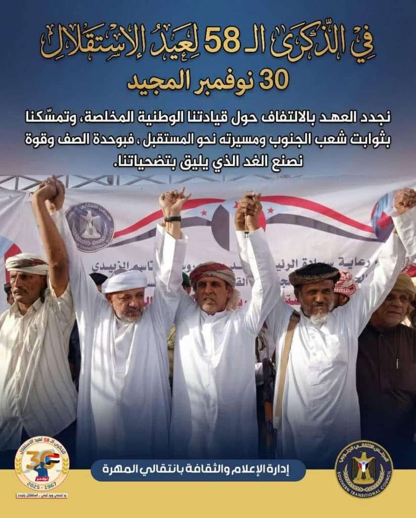 وبهذه المناسبة الوطنية الخالدة ندعو الله أن يوفقكم ويسدد خطاكم وأن يعيد هذا اليوم على الجنوب وشعبه بالأمن والازدهار وتحقيق كل تطلعاته المشروعة.