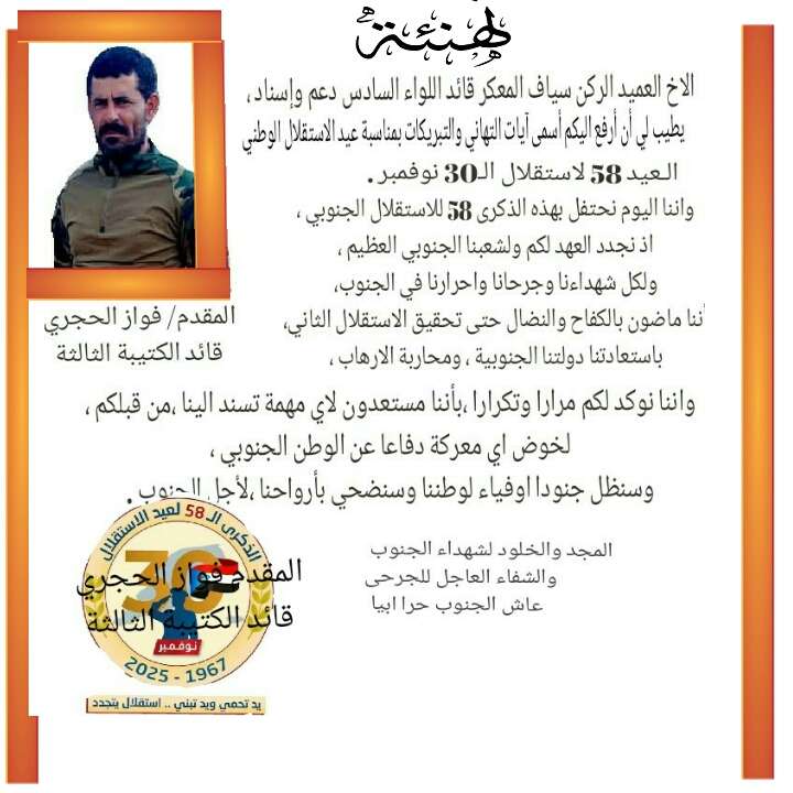 بعث قائد الكتيبـــة الثالثة المقدم/فواز الحجري برقية تهنئة إلى قيادة اللواء السادس دعم واسناد، بمناسبة الذكرى ال 58 لعيد الاستقلال الوطني الجنوبي ال 30 من  نوفمبر المجيد .