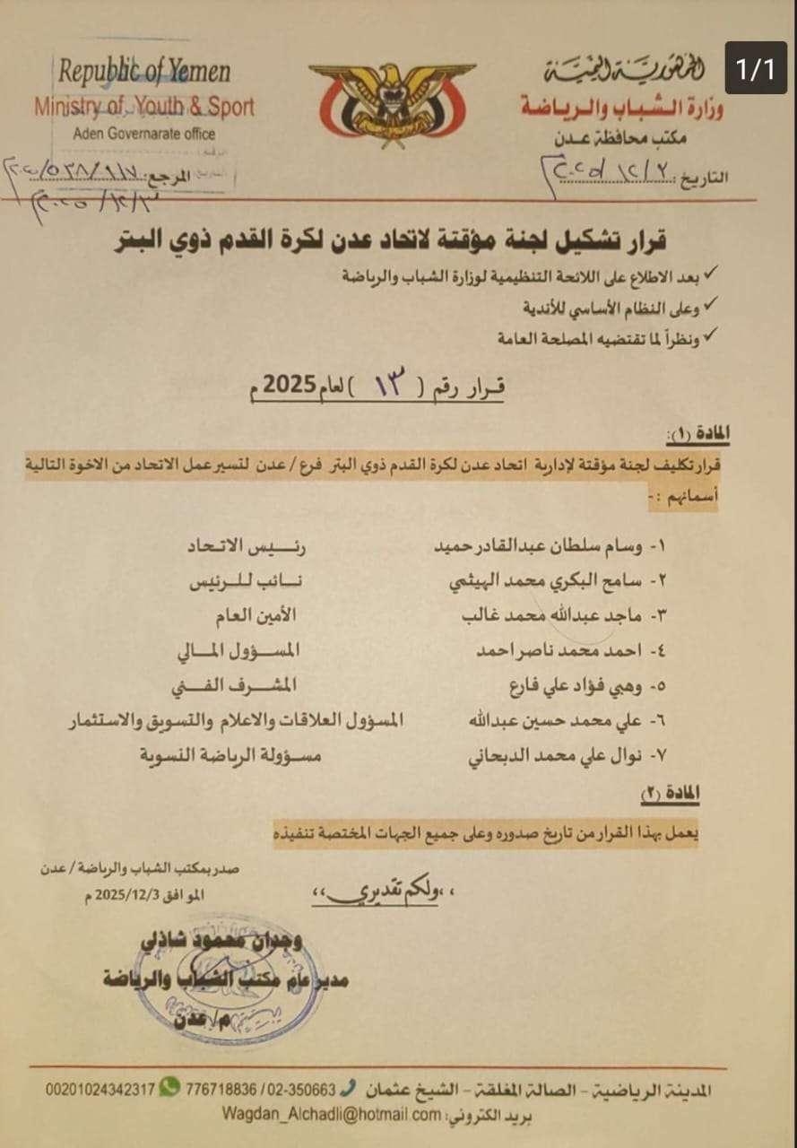 قرار تكليف بإنشاء إتحاد عدن لكرة القدم البتر