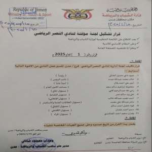 وجدان شاذلي يصدر قرار بتكليف عبود ناجي رئيسا جديد لنادي النصر الرياضي بعدن