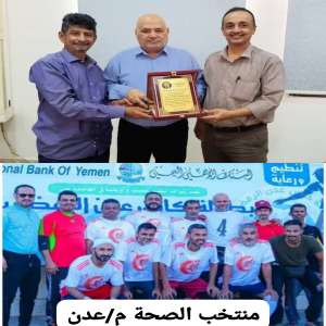 إدارة ولاعبي فريق منتخب الصحة لكرة القدم يتقدمون لمدير عام الصحة بعدن درع شكر و تقدير