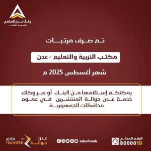 بدء صرف مرتبات تربية عدن لشهر أغسطس 2025