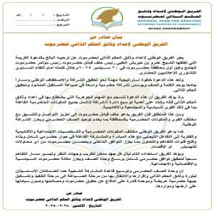 الفريق الوطني لإعداد وثائق الحكم الذاتي يرحّب بدعوة بن حبريش ويشدد على وحدة الصف الحضرمي