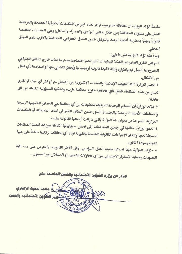 1 - رفض التقرير الصادر عن الشبكة اليمنية المذكور لعدم اختصاصها بممارسة نشاط خارج النطاق الجغرافي المصرح لها بالعمل فيه واعتباره وثيقة لا قيمة قانونية أو مهنية لها ويُحظر التعاطي معها أو اعتمادها بأي شكل من الأشكال.