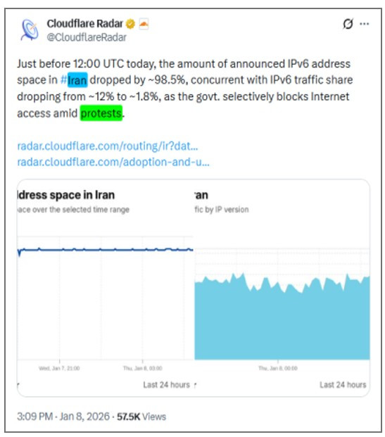 كما تُظهر البيانات الفنية لـ "رادار كلاود فلير" (Cloudflare Radar) أنه قبيل الساعة ۱۳:۰۰ بالتوقیت المحلي، شهدت مساحة العنونة (IPv6) في إيران سقوطاً حاداً بنسبة ۹۸.۵٪، وانخفضت حركة المرور لهذا البروتوكول من %12 إلى ۱.۸٪ فقط.