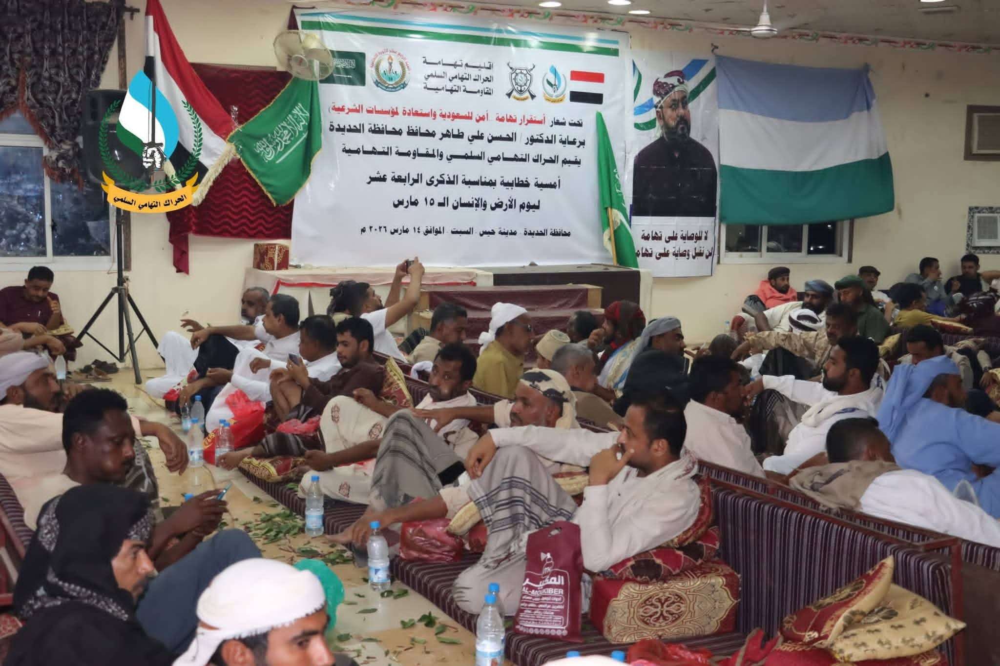 أقام الحراك التهامي السلمي والمقاومة التهامية، مساء أمس السبت في مدينة "حيس" التاريخية، أمسية خطابية وجماهيرية حاشدة بمناسبة الذكرى الرابعة عشرة لـ "15 مارس.. يوم الأرض والإنسان التهامي". الفعالية التي أقيمت تحت شعار: (استقرار تهامة.. أمن للسعودية واستعادة لمؤسسات الشرعية)، شهدت حضوراً رسمياً وشعبياً لافتاً تقدمه محافظ المحافظة رئيس المجلس المحلي الدكتور الحسن الطاهر، وقيادات الحراك والمقاومة التهامية، ووجهاء وأعيان الحديدة