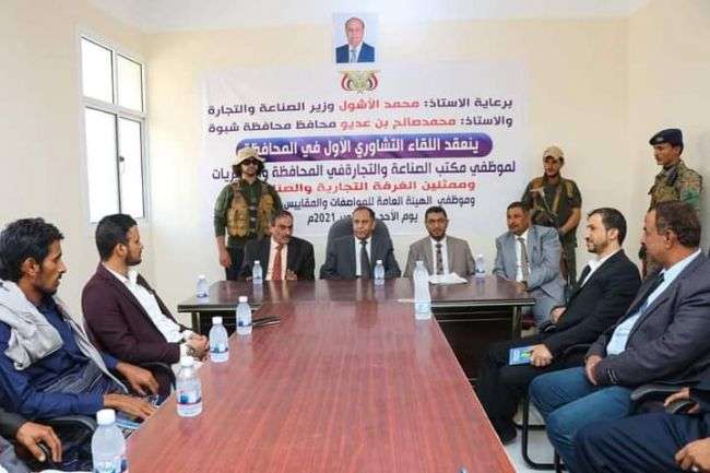 ناقش وزير الصناعة والتجارة محمد الأشول ومحافظ شبوة محمد صالح بن عديو صباح اليوم مع مكتب الصناعة والتجارة وفرع الهيئة العامة للمواصفات والمقاييس وممثلين عن الغرفة التجارية ورجال المال والأعمال سبل تنظيم الحركة التجارة والرقابة على الأسعار في الأسواق وحماية المستهلك في المحافظة.