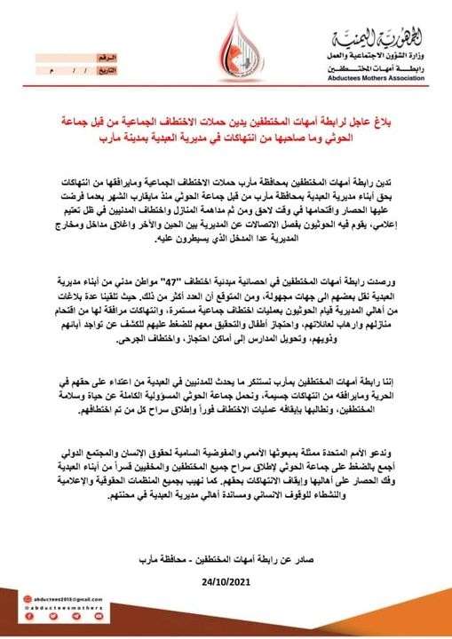 وقالت رابطة أمهات المختطفين في بلاغ لها ، بان الاحصائيات الأولية التي تلقتها حول اختطاف قرابة 47 من المدنيين من قبل مليشيا الحوثي الانقلابية في العبدية
