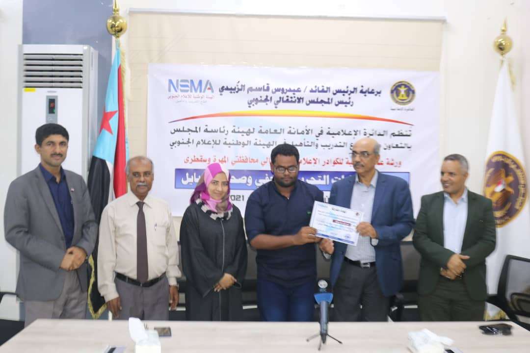 اختتمت الدائرة الإعلامية لهيئة رئاسة المجلس الانتقالي الجنوبي اليوم الخميس، في العاصمة عدن، ورشة العمل التدريبية التي نظمتها بالتنسيق مع قطاع التدريب والتأهيل بالهيئة الوطنية للإعلام الجنوبي، لتعزيز مهارات منتسبي الإدارات الإعلامية في محافظتي المهرة وسقطرى في التحرير الصحفي وصحافة الموبايل، برعاية الرئيس القائد عيدروس الزُبيدي رئيس المجلس الانتقالي الجنوبي.