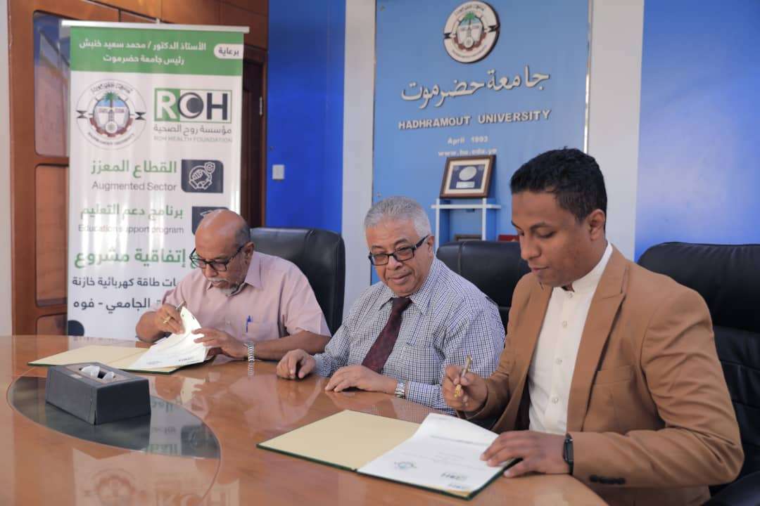 جرى بديوان رئاسة الجامعة التوقيع على اتفاقية بين جامعة حضرموت ومؤسسة روح الصحية بالمكلا ، وقع الاتفاقية كل من أ. د. سالم مبارك العوبثاني نائب رئيس الجامعة لشئون الطلاب ، والدكتور محمد صالح باجرش المدير التنفيذي لمؤسسة روح الصحية، وتعميد رئيس الجامعة على الاتفاقية، وقعه نيابة عنه أ . د . عبدالله صالح بابعير نائب رئيس الجامعة للشئون الاكاديمية.