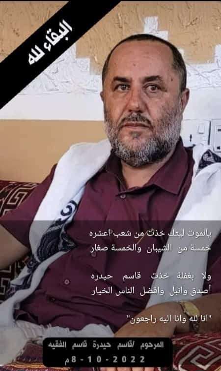 بقلوب مؤمنة بقضاء الله وقدرة تلقينا نباء وفاة الشخصية الاجتماعية ورجل الخير والعطاء الاخ/قاسم حيدرة قاسم صالح الذي توفاه الاجل أثر مرض الم به مساء يوم الجمعة الموافق 7 أكتوبر 2022م.