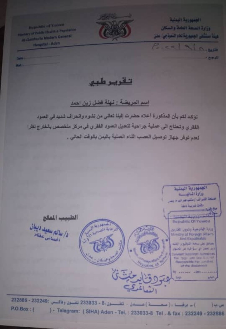 ناشدت الطفلة نهلة المحرمي البالغة من العمر 12 عاماً التي تنتمي إلى جبل محرم في مديرية يافع رصد بمحافظة أبين أهل الخير والعطاء إلى المساهمة في إنقاذ حياتها مما تعاني من تشوه وانحراف شديد في العمود الفقري سبب لها إعاقة وحرمان من العيش حياة طبيعية كبقية الأطفال وهي بحاجة إلى عملية جراحية لتعديل الفقرات في مركز متخصص بالخارج حسب تقرير الأطباء، وبسبب الظروف الصعبة لوالدها لم يتمكن من علاجها في الخارج للتكلفة الكبيرة التي تقدر ب 40 ألف دولار.