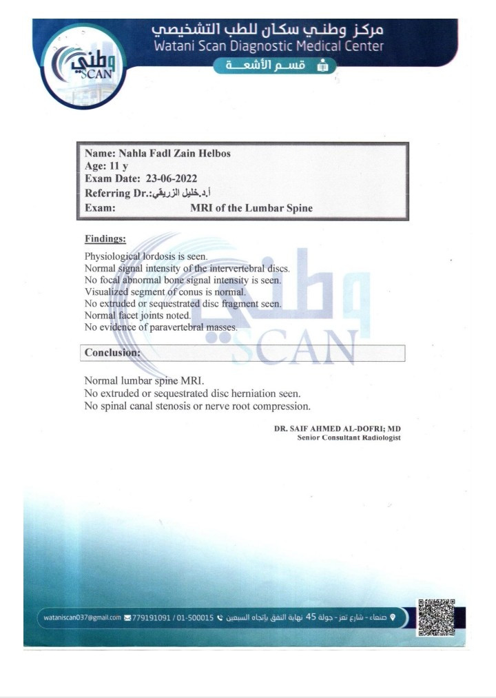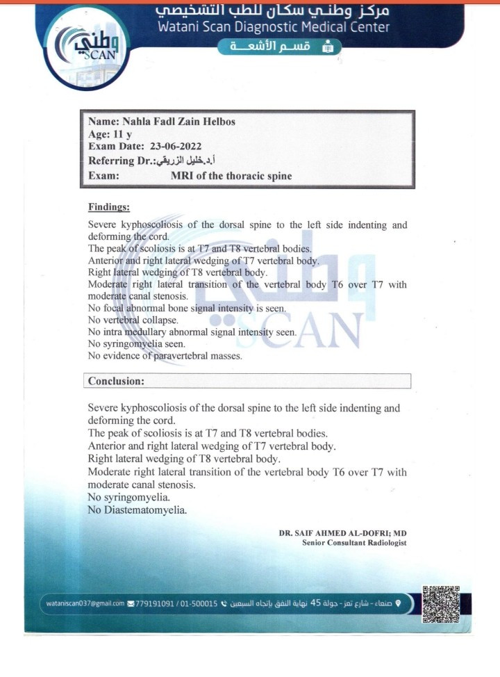 ولهذا أطلقت الطفلة نهلة المحرمي مناشدة إنسانية لأهل الخير من أبناء يافع من رجال المال والأعمال وكل المقتدرين المشهود لهم بالفزعات مد يد العون لوالدها لإنقاذ حياتها وعلاجها بالخارج بصورة مستعجلة لأن فقرات عمودها الفقري تزداد بالانحناء والتشوه مع مرور الأيام ما يزيد من تدهور صحتها بصورة مستمرة.