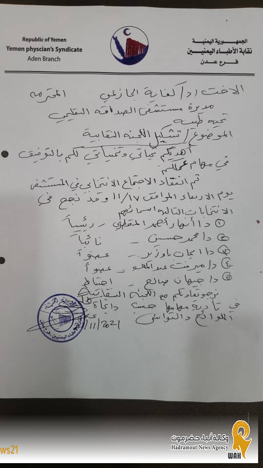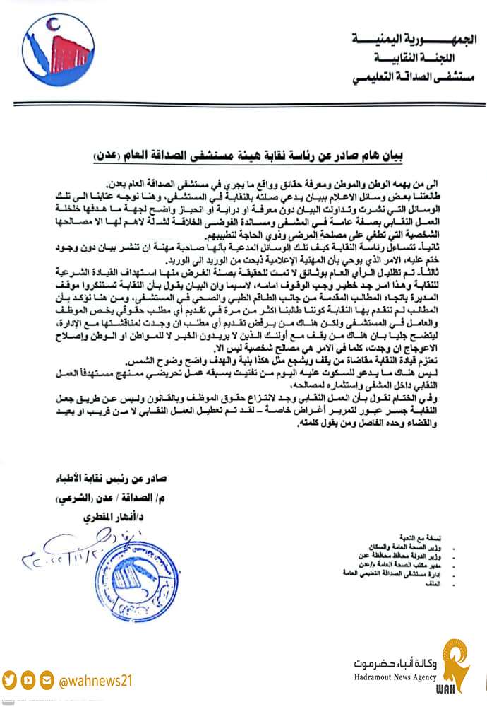 وتاسفت الدكتورة /انهار المقطري، رئيس نقابة اطباء المشفى والتي تم انتخابها بصورة رسمية وبحسب البيان الذي تاسف على انجرار وسائل الإعلام وراء نشر بيانات لاتحمل الصفة الأهلية والمتمثلة بالاختام.