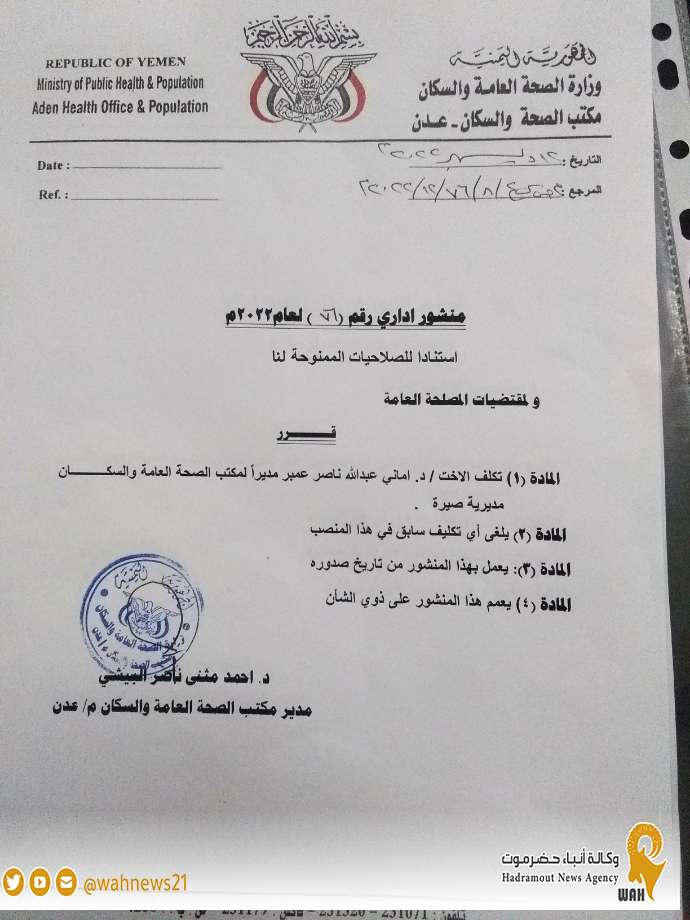 الماده (1):تكلف الاخت /د.اماني عبدالله ناصر عمير مديراً لمكتب الصحة العامة والسكان بمديرية صيرة.