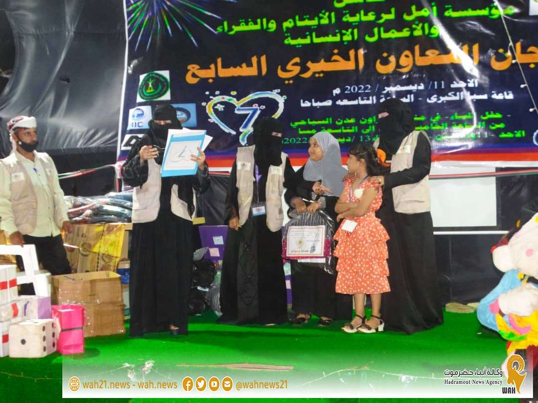 برعاية محافظ محافظة عدن الأستاذ أحمد حامد لملس ..أختتمت مؤسسة أمل لرعاية الأيتام والفقراء مساء أمس مهرجان التعاون الخيري السابع والذي لمده ثلاثة أيام متتالية