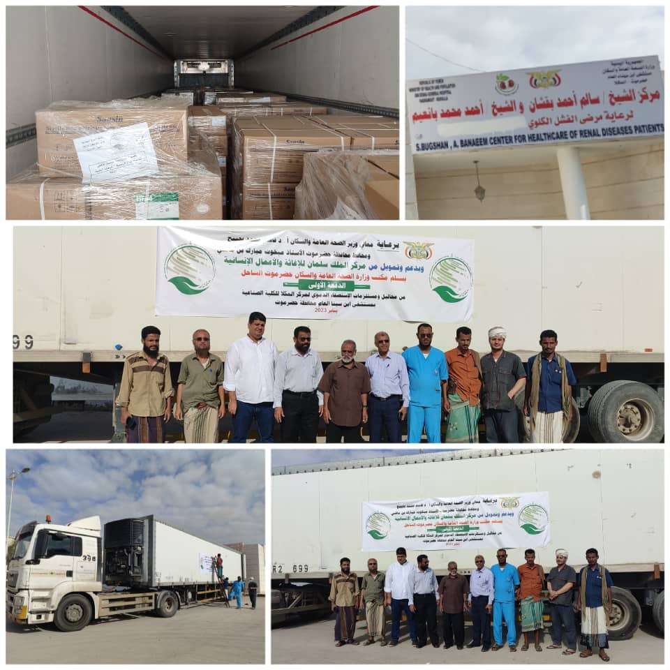 استلام شحنة كميات من  المحاليل ومستلزمات الإستصفاء الدموي الدفعة الأولى بدعم وتمويل من مركز الملك سلمان للإغاثة والأعمال الإنسانية ، وذلك برعاية كريمة من معالي وزير الصحة العامة والسكان الأستاذ الدكتور قاسم محمد بحيبح و محافظ محافظة حضرموت الأستاذ مبخوت مبارك بن ماضي .