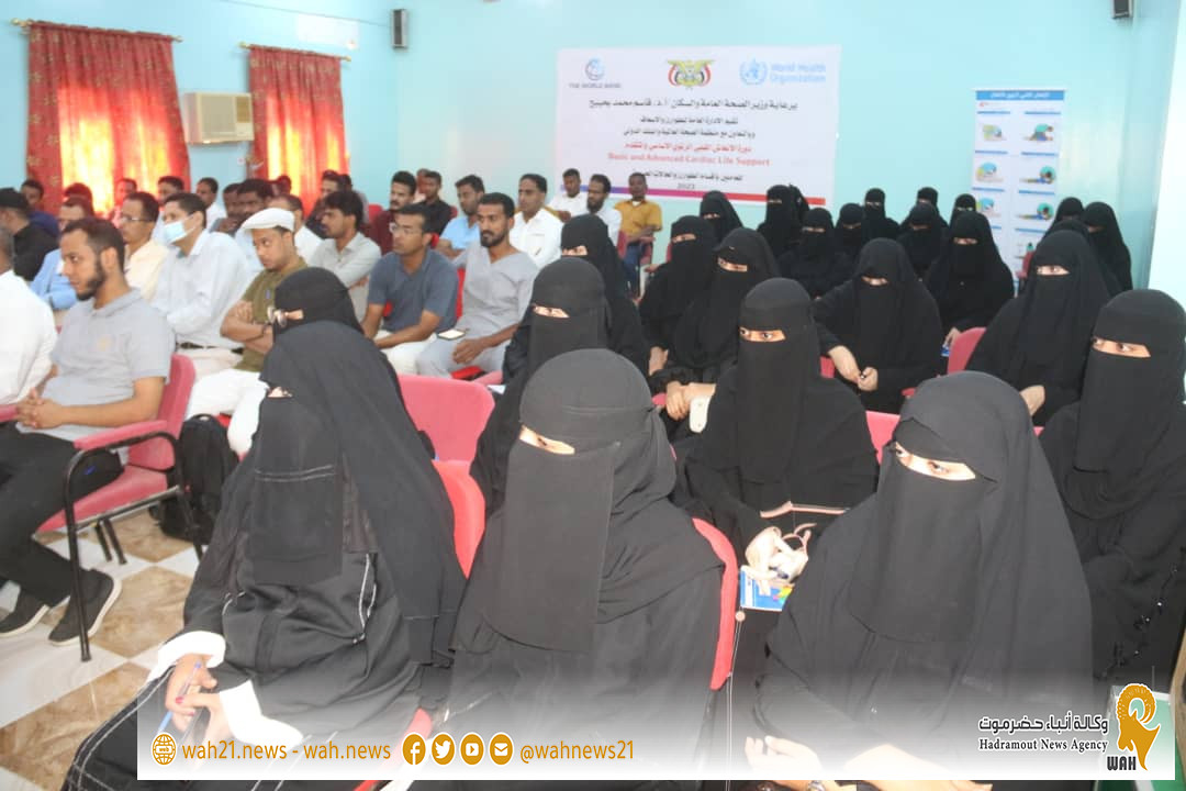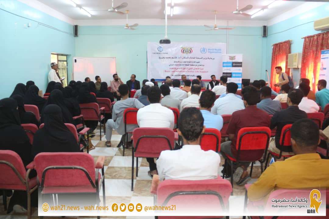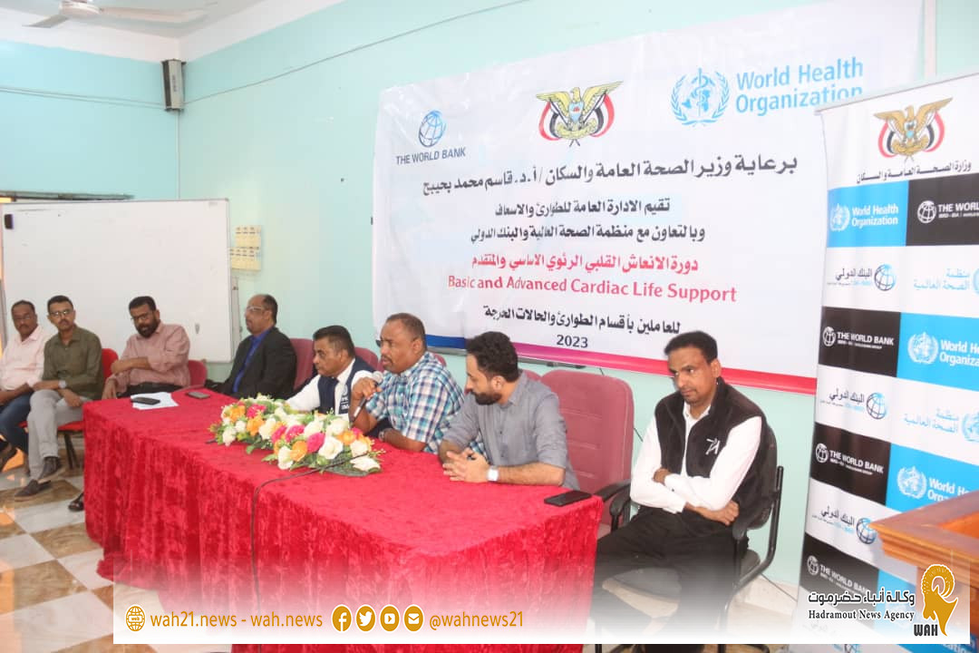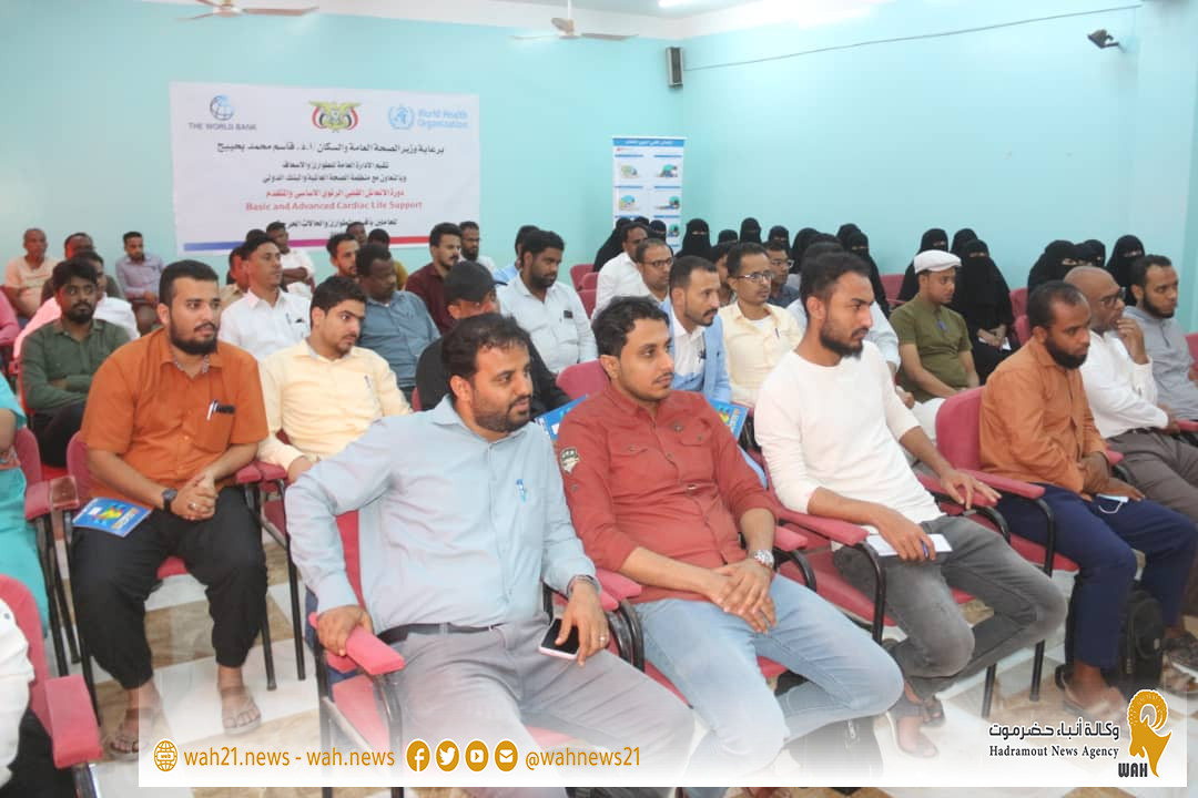 دشنت بقاعة الفقيد الدكتور رياض الجريري بمعهد العلوم الصحية بالمكلا فعاليات الدورة التدريبية حول ,, الانعاش القلبي الرئوي الاساسي و المتقدم ,, للعاملين بأقسام الطورائ والحالات الحرجة ، تنظمها الإدارة العامة للطوارئ والأسعاف بالتعاون مع منظمة الصحة العالمية و البنك الدولي ، وذلك برعاية كريمة من معالي وزير الصحة العامة والسكان الأستاذ الدكتور قاسم محمد بحيبح التي تستمر على مدى أربعة أيام بمشاركة 85 مشارك ومشاركة بمستشفيات المكلا الحكومية .