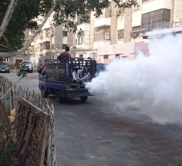 يواصل قسم صحة البيئة بمديرية صيرة محافظة عدن تنفيذ حملة الرش الضبابي لمكافحة الحشرات الناقلة للأمراض والأوبئة في الأحياء والمنشآت الخدمية و التعليمية بالمديرية.
