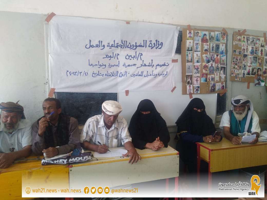 وسط أجواء ممتلئه بالود والاخاء والوفاء للمعاقين ،دشن صباح يوم الثلاثاء الموافق 2023/3/21 بمديرية لودر منطقة امصرة النخعيين اشهار جمعية المعاقين, ذالك بحضور الأخت مديرة إدارة الشؤون الاجتماعية والعمل بالمجلس الانتقالي الجنوبي محافظة أبين جيهان حيدره والاخ جمال موسى مدير الشؤون الاجتماعية والعمل بالسلطه المحليه بالمديرية لودر.