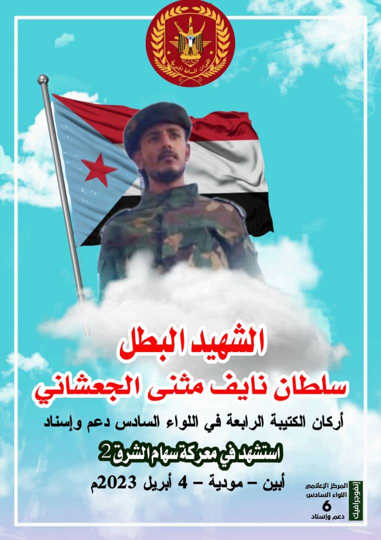 "بقلوب مؤمنة بقضاء الله وقدرة تلقينا نباء استشهاد احد ابطال قواتنا المسلحه الجنوبيه وهوا الشهيد البطل /سلطان نائف مثنئ الجعشاني اركان الكتيبه الرابعه في اللواء رحمة الله تغشاة في اواسط شهر رمضان المبارك حيث كان ينفذ مهمه اسعاف ونقل جرحئ احداث موديه من زملائه في محور ابين القتالي .
